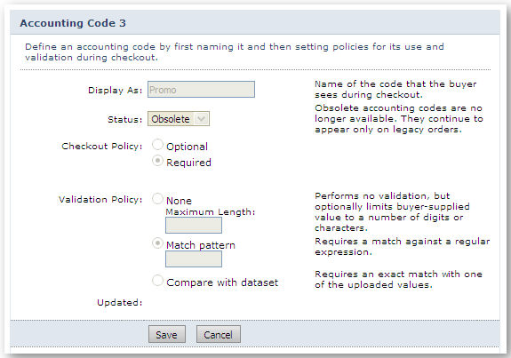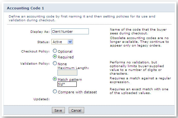 Accounting codes expand the concept of cost centers. They are a means by which you can collect additional data about each order during checkout using text fields you can customize.