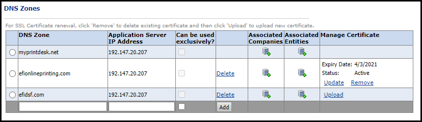 The name entered in the DNS Zone field must match one of the DNS names that the uploaded certificate supports. If it does not, the system will not allow the upload. Do not use * in the DNS Zone column to try to specify a wildcard certificate.