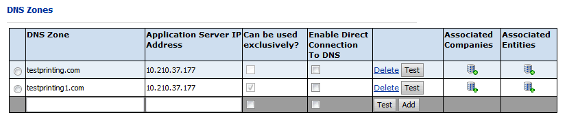 Graphic Communications hosted SitesBefore adding a DNS Zone in MarketDirect StoreFront, you should ensure that it is added to the DNS Server. MarketDirect StoreFront cannot add the DNS Zone directly to the DNS Server. When you add a DNS Zone in MarketDirect StoreFront, however, MarketDirect StoreFront checks whether the zone exists in the DNS Server. The Test button will also do this. Note that this can be done only when a direct connection to DNS is enabled.