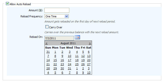 ● Allow Auto Reload: Check this box to have the spending limit reload at a specified interval.