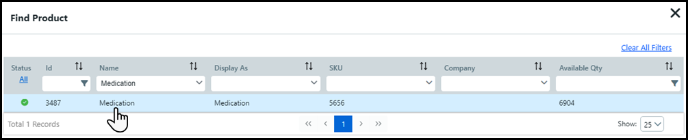3 Only Fulfillment products enabled for Lots will appear in the Find Product window. Search, sort, and/or filter different columns to find the appropriate product.