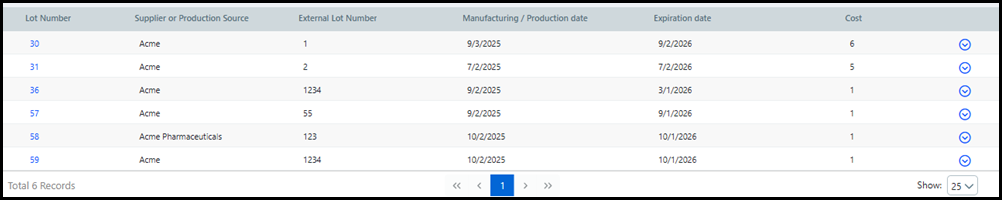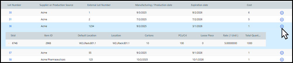 Click the down caret in the appropriate row of the Lot Management table to reveal details about each skid in the Lot.