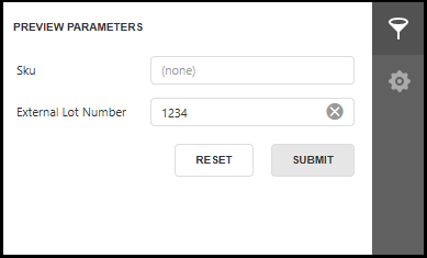 4 Enter an SKU number and/or External Lot Number into the Preview Parameters to retrieve Lot information.