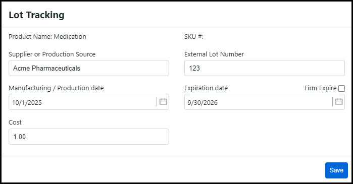 ● External Lot Number: Enter the lot number provided by the supplier or manufacturer.
