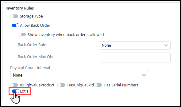 4 Enable the Lot's toggle in the Inventory Rules section.
