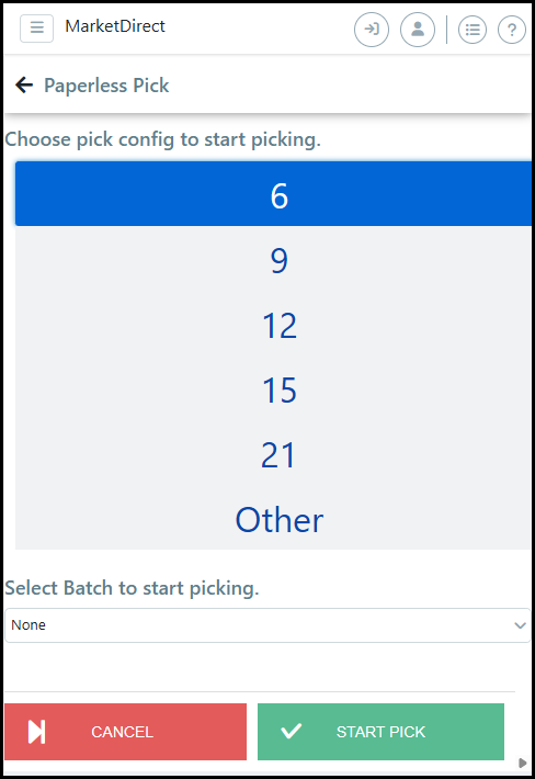 3 Tap the number of totes for the pick from the Choose pick config to start picking list.
