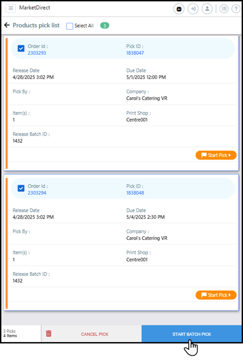 5 Verify all orders are selected on the Products pick list page and tap Start Batch Pick.