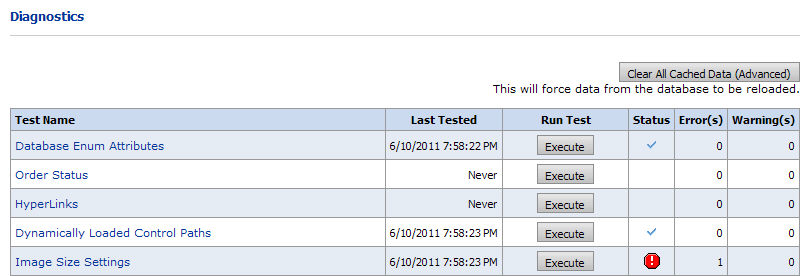 2 On the Diagnostics page, click Clear All Cached Data (Advanced) to force the database to reload, thus refreshing all data. Doing this will reset all test data (e.g., statuses) and delete all prior test results.