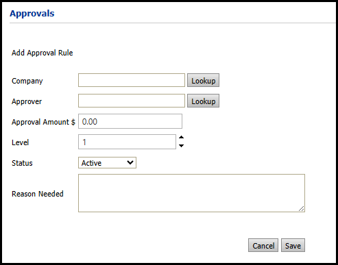 ● Add Company Rule: Sets up a company approval (meaning all orders placed through the specified company over the specified amount must be approved).