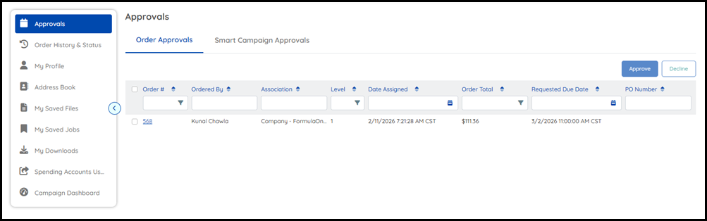 Orders can be approved or declined from the Approvals tab