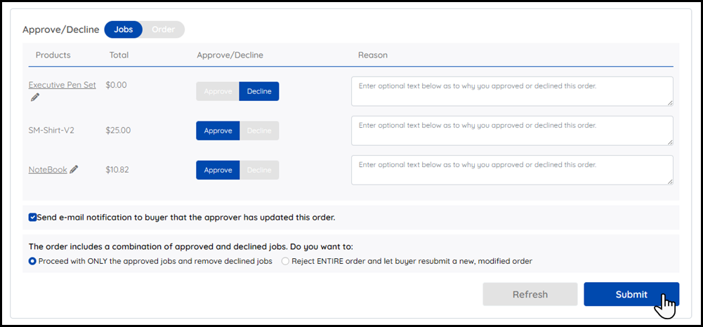 If you decline one or more jobs within the order and approve one or more jobs within the order, the declined jobs will be permanently removed from the order and not shown in the buyer's order history.