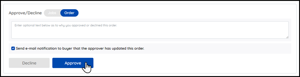 5 For order-level approvals, click to Approve or Decline the order, which will update the Order Status (available to the buyer in the Order Details on the Order Confirmation page) and send an email notification to the buyer (if the check-box is selected).