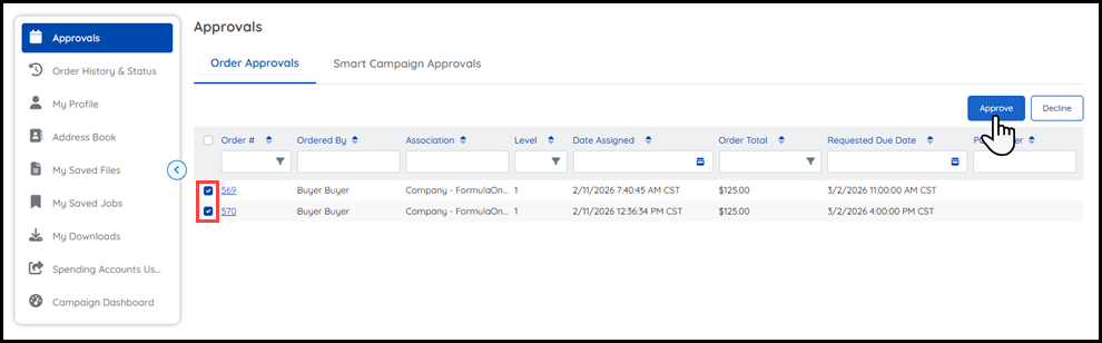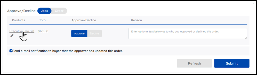 MarketDirect StoreFront's approval system lets you define approvals at both the order level (an approver can either approve or decline an entire order) and the job level (an approver can approve or decline the jobs within an order or make edits to the jobs within the order to affect the price before approving).