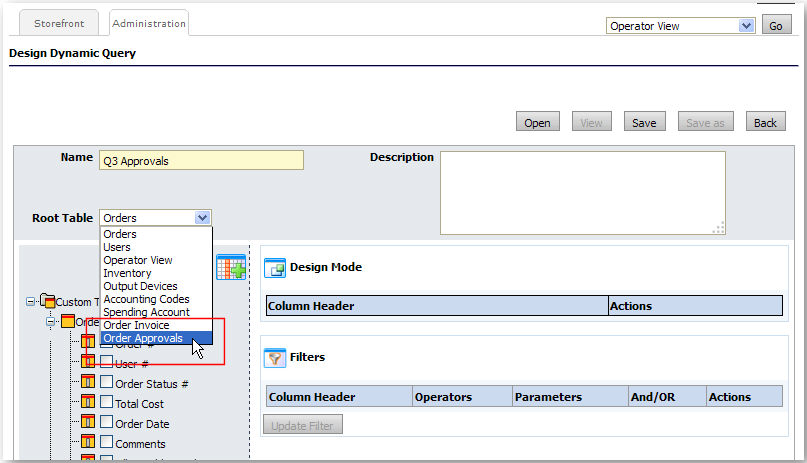 4 From the Root Table pull-down menu, select "Order Approvals."