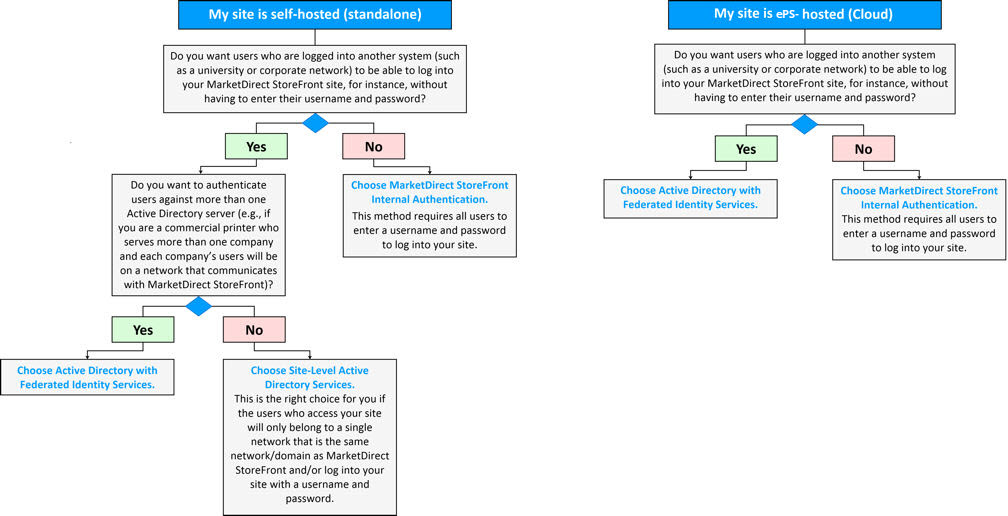 Active Directory Authentication authenticates users who attempt to log into your site against an authoritative directory on a trusted Active Directory server and then assigns appropriate access and permissions and shares user information with the trusted server, for example, for single sign-on (SSO). Active Directory Authentication in MarketDirect StoreFront is offered in two modes: Site-Level Active Directory Authentication and Active Directory Services with Federated Identity Services for site and/or company level authentication.