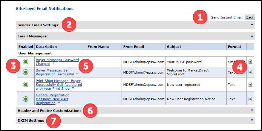 Email notifications exist at two levels in MarketDirect StoreFront—at the site level and at the company level. You will access the Company-Level Email Notifications page from the Manage Company page.