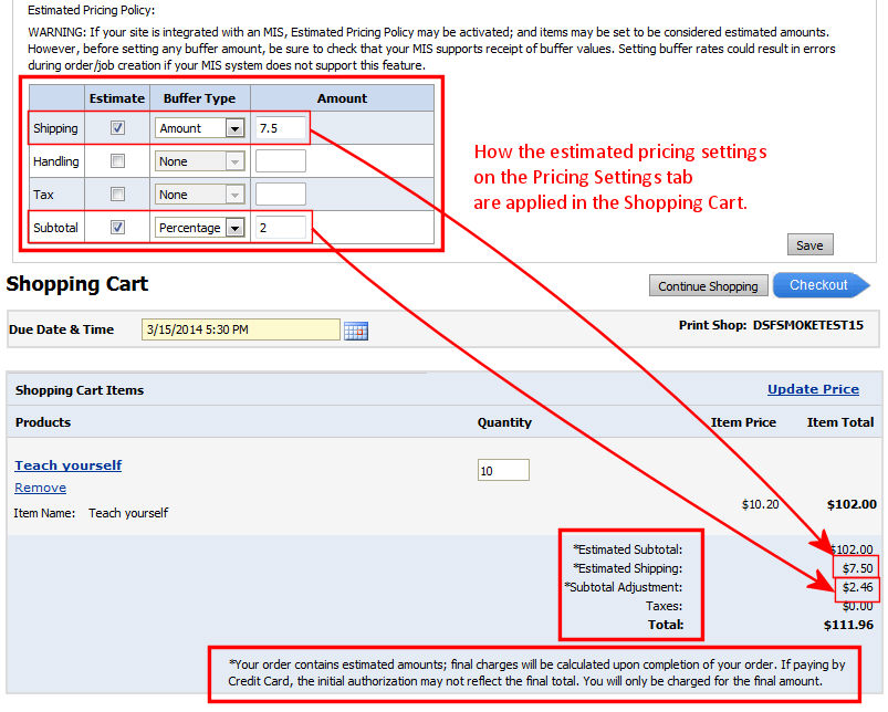 For sites integrated with an MIS: If you want to use the estimated pricing feature, make sure that your MIS supports receiving buffer values. If it does not, you can use estimated pricing (e.g., to designate a bucket such as shipping, handling, etc.) as estimated, not actual, but leave the Buffer Type option set to None so you cannot enter an amount. The message will still be displayed in checkout in this case, but no additional buffer amounts will be added to the order.
