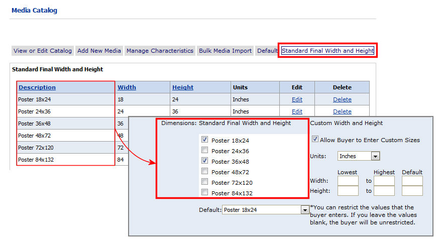 1         On the Media Catalog > Standard Final Width and Height tab configure the final width and height using the fields below.