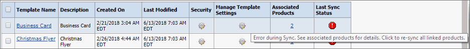 ● In the event of any failure in synchronizing the changes, MarketDirect StoreFront will display an error icon in the Last Sync Status column of the corresponding template. In this case you can: