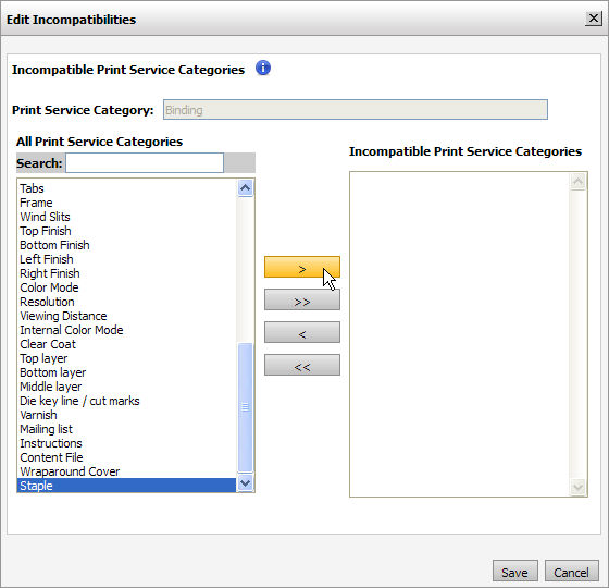 2 To make an entire print service category incompatible with the selected category (i.e., if you want to disable all binding options when a buyer selects any stapling print service, and vice versa):