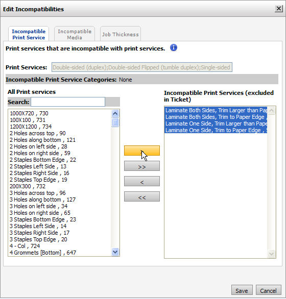 ● On the Edit Incompatibilities window, select the appropriate tab for what you want to make incompatible with the print service: