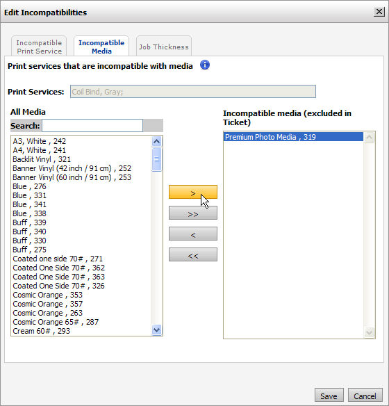 of Intelligent (Conditional) TicketingIntelligent (conditional) ticketing functionality is also available on the Media Catalog page. There you can establish incompatibility rules between specified Media and print services. For more information, see Intelligent (Conditional) Ticketing.