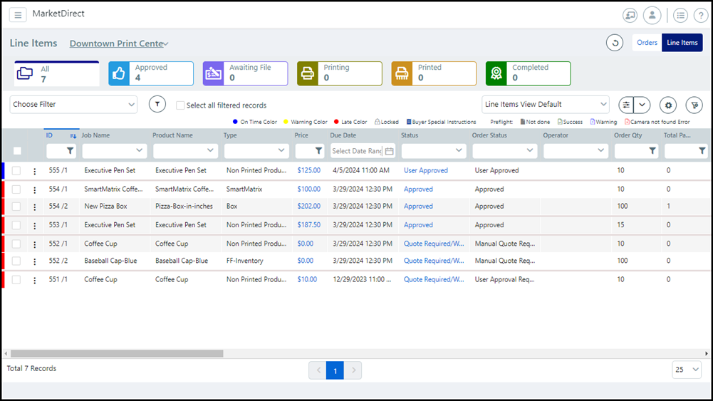 ● If the administrator enables preflighting in the product creation process (see Create Products), the system will automatically run a preflight check on the job files upon submission. An icon will show up in the Operator View next to the appropriate line item denoting whether the preflight check yielded a Success, Warning, or Error.