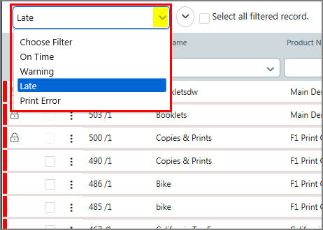 Current status of the job. To filter this attribute: In the column header field, select an option from the drop-down list. Order View and Operator View both have a status list box that shows the current status of the order or job. When the order status is first set for an order, that status initially controls the job status in Operator View. ● In Order View, each order has only one status, whether the order contains one or multiple jobs. ● In Operator View, each job within an order displays separately and has its own status. The Manage Status tool enables you to configure the relationship between the Operator View and Order View statuses. For more information, see Manage Status. |