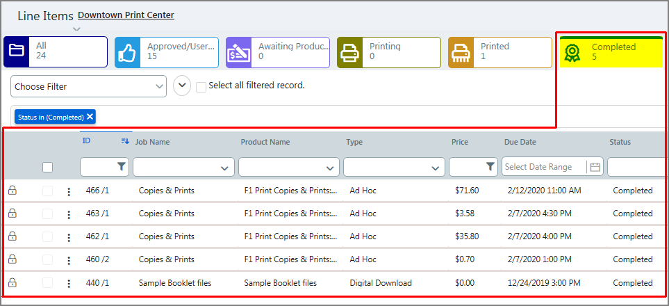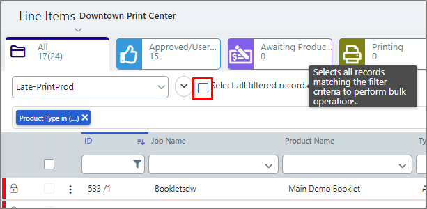 Notes on Filtering the Data in the Jobs Table Using Data Columns Adding Filters ● For fixed category data columns such as Product Type and Order Status, you can filter on any of the available options: ● Click the down arrow. ● Select one or more check boxes. ● For data columns with user-defined values such as Job Name, Product Name, Buyer Special Instructions, and Document, you can filter using partial or complete matches using like search terms entered directly in the field. ● Numerical value data columns (e.g., ID, Order Qty, Total Pages, etc.) can be filtered using operators. Any column with a filter can take value operators: