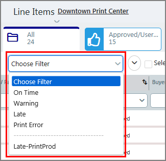 Output device associated with the job. To filter this attribute: In the column header field, select an option from the drop-down list. You can edit this attribute for each line item by clicking the pencil icon in the field and selecting an option from the drop-down list. |
