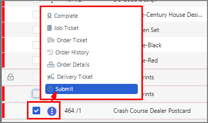 Opens the quick access menu that lets you perform the following job management tasks for each job in the jobs table: ● Submit ● Complete ● Job Ticket ● Order Ticket ● Order History ● Order Details ● Delivery Ticket |